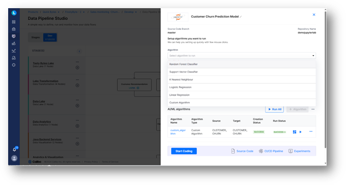 The platform helps them by offering pre-integrated tech stacks like Python with JupyterLab. It also provides self-service capabilities for developing, testing, and deploying their solutions, alongside source code management, CI/CD pipeline automation, and deployment orchestration. Embedded ready-to-use ML algorithms may be used to further speed up their work.